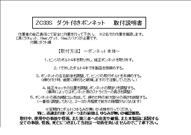 価格改定 エアロボンネット(FRP+C) for ZC33S 塗装済